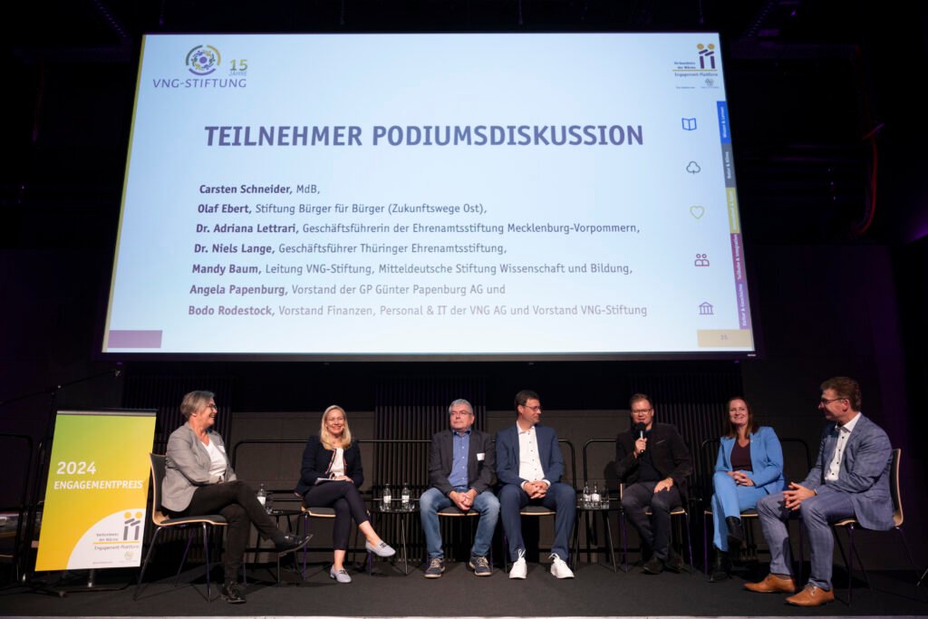 In einer Podiumsdiskussion traten Vertreter aus Wirtschaft, Politik und Zivilgesellschaft auf die Bühne und diskutierten über Themen wie das Gemeinwohl in Ostdeutschland, die gefühlte Lage nach den Landtagswahlen in den neuen Bundesländern und die Zusammenarbeit regionaler Akteure zur Stärkung ehrenamtlicher Initiativen.