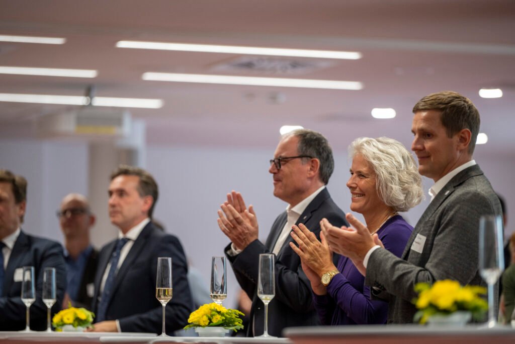 (v. l. n. r.) Angela Papenburg, Vorstand GP Günter Papenburg AG, Mandy Baum, Leitung Stiftungen von VNG, Niels Lange, Geschäftsführer der Thüringer Ehrenamtsstiftung, Olaf Ebert, Vorstandsvorsitzender Stiftung Bürger für Bürger, Carsten Schneider, Staatsminister beim Bundeskanzler und Beauftragter der Bundesregierung für Ostdeutschland, Adriana Lettrari, Geschäftsführerin der Ehrenamtsstiftung Mecklenburg-Vorpommern, Bodo Rodestock, Vorstand Finanzen, Personal & IT der VNG AG und Vorstandsmitglied VNG-Stiftung.