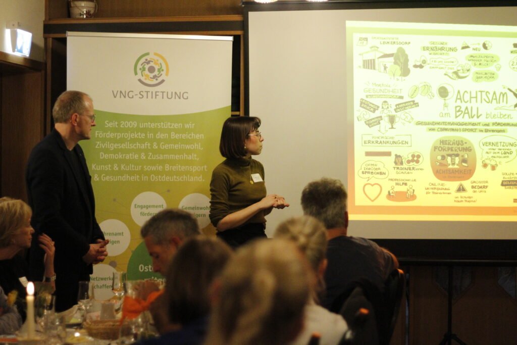 Unter dem Titel „Achtsam am Ball bleiben! Gesundheitsmanagement und Förderung von Breitensport im Ehrenamt.“ hat die VNG-Stiftung mit dem Landessportbund Sachsen (LSB) am 18. November 2024 deshalb zu einer aktiven Austauschrunde in die Sportgasstätte Leukersdorf eingeladen.