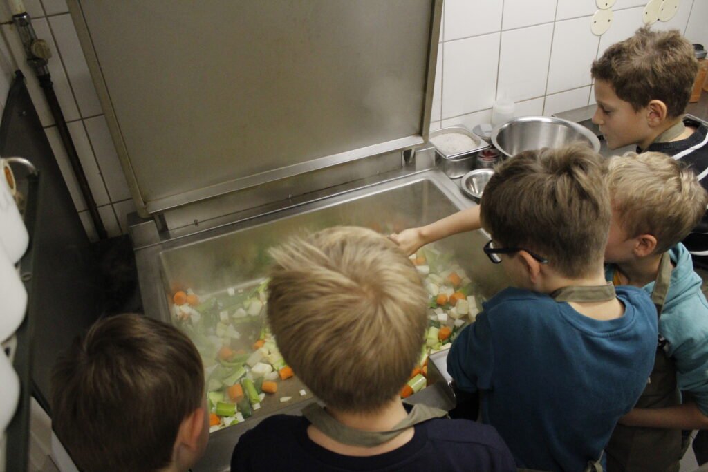 Als besondere Gäste wurden im Anschluss an die Gesprächsrunde „Die Besseresser“ der Grundschule „TINTENFASS“ aus Jahnsdorf begrüßt. Frisch ausgestattet mit neuen Küchenschürzen durch die VNG-Stiftung, kochten die Grundschüler*innen mit den Teilnehmer*innen des Round Table eine Kartoffelsuppe fürs gemeinsame Mittagessen und backten gemeinsam Weihnachtskekse für das Seniorenheim „Grüne Aue“ in Jahnsdorf.