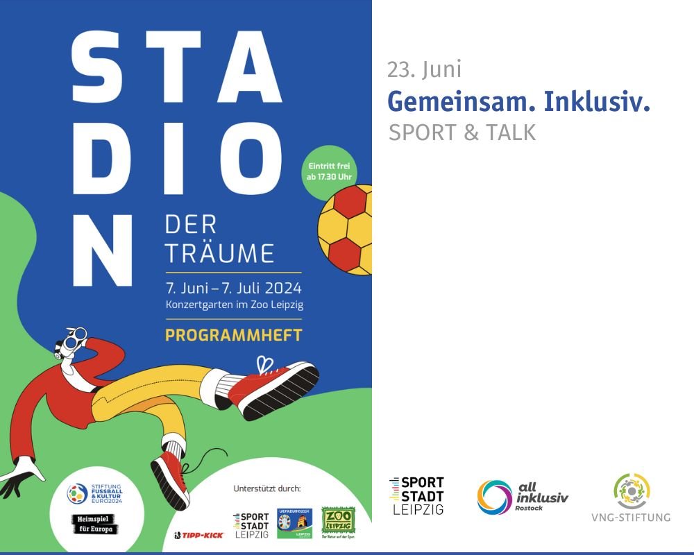 Zoo Leipzig Pfaffendorfer Str. 29, Leipzig, Sachsen, DeutschlandIn Zusammenarbeit mit dem Olympiastützpunkt Leipzig und Zehnkampf-Olympiasieger Christian Schenk und Vorsitzender all inklusiv Rostock e.V. wird am 23.06.2024 für Menschen mit Beeinträchtigung ein bunter Tag voller Sport, Netzwerken, Erfahrungsaustausch und vor allem viel Spaß im Zoo Leipzig stattfinden. Durch die Kooperation mit der VNG-Stiftung werden eine Podiumsdiskussion zum Thema Inklusion mit prominenten Sportler*innen und Persönlichkeiten, ein Workshop für inklusive Vereine sowie vielfältige Mitmachangebote im "Stadion der Träume" das inklusive Miteinander fördern.