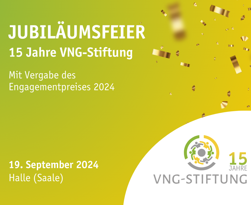 MMZ - Multimediazentrum Halle (Saale) Mansfelder Str. 56,, Halle (Saale), Sachsen-Anhalt, DeutschlandZum dritten Mal vergibt die VNG-Stiftung im Rahmen der Engagement-Plattform Verbundnetz der Wärme ihren Engagementpreis. In diesem Jahr in einem besonderen Rahmen, denn die VNG-Stiftung feiert ihr 15-jähriges Bestehen. Für den 19. September 2024 planen wir eine gemeinsame Jubiläumsfeier mit Preisverleihung im MMZ Mitteldeutsches Multimediazentrum, bei der wir das Miteinander mit unserem Netzwerk erleben möchten. Geplant ist ein buntes Potpourri an Veranstaltungspunkten: Auf einem Markt der Möglichkeiten können sich gemeinnützige Vereine und Stiftungen mit einem Stand präsentieren und ihre Initiativen vorstellen. Bei der Verleihung des Engagementpreises zeichnet die VNG-Stiftung fünf ostdeutsche Initiativen aus. Jeder Preis ist mit 5.000 Euro dotiert und wird in den fünf Engagementbereichen des Verbundnetz der Wärme vergeben. Im Rahmen der Preisverleihung findet eine spannende Podiumsdiskussion mit Vertretern aus Wirtschaft, Zivilgesellschaft und Politik statt. Der feierliche Ausklang wird im Rahmen einer Abendveranstaltung mit vielen tollen Programmpunkten gemeinsam mit Wegbegleitern und Partnern der VNG-Stiftung gefeiert.